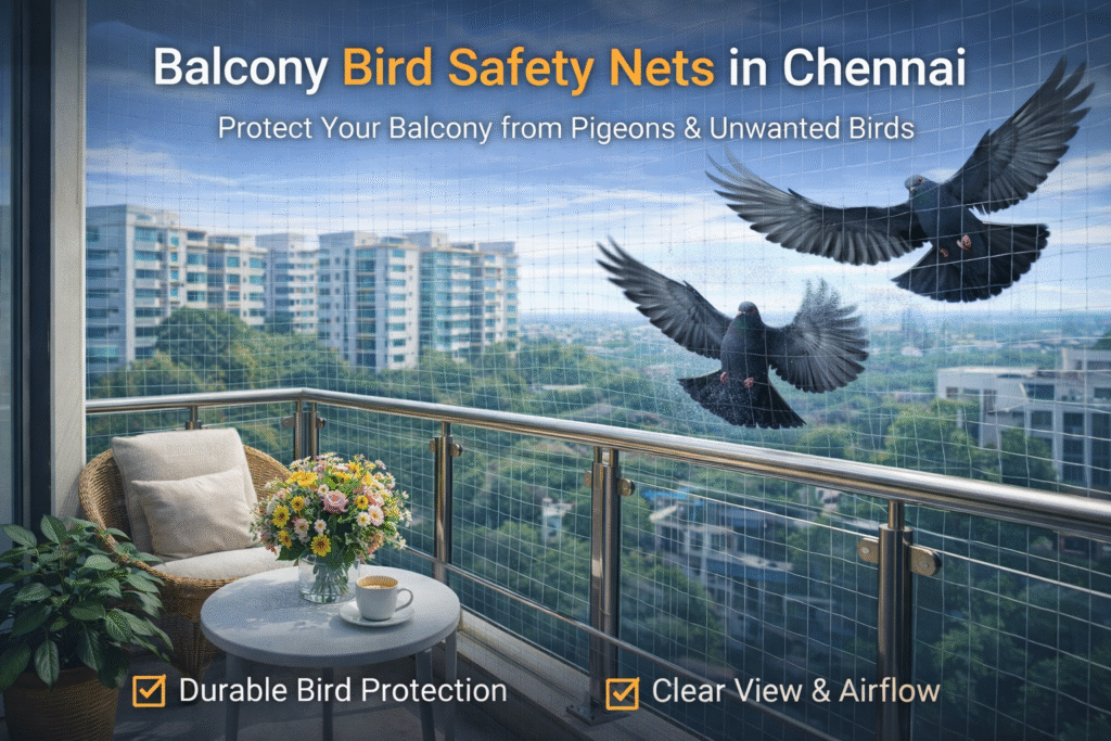 Protect your balcony from pigeons and unwanted birds with our professional balcony bird safety nets in Chennai. Our bird net installation for balconies in Chennai prevents pigeons from entering, nesting, and creating mess in apartment balconies and high-rise buildings.