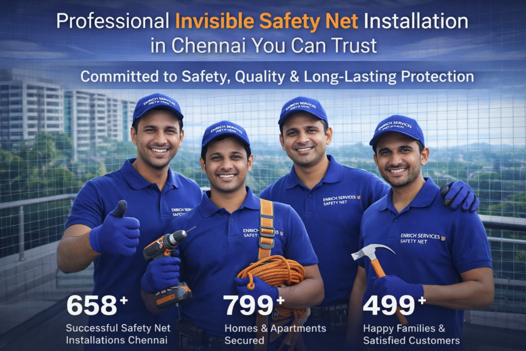 In addition, our local Chennai technicians ensure fast response, free on-site inspection, and quick installation of balcony safety nets, window safety nets, child safety nets, pet safety nets, and pigeon safety nets. Therefore, if you are searching for the best invisible safety nets near you in Chennai, Enrich Services is your trusted local partner for safe, affordable, and long-lasting safety net solutions.